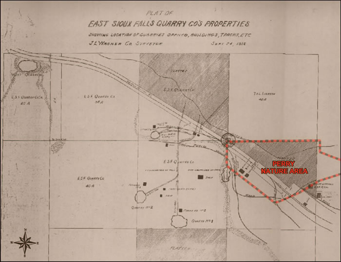 The G.H. Perry family owned the East Sioux Falls town site for over one hundred years. In 1999, the family donated a majority of the original town site to the county. The property is being developed as Perry Nature Area, a public recreation facility that preserves the site's historic and natural features.